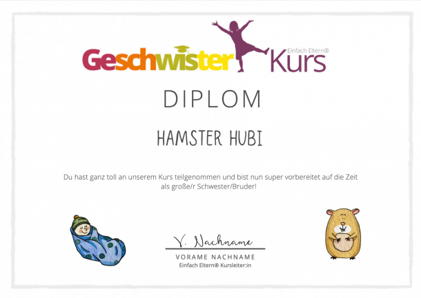Mit Puppen lernen die teilnehmenden Kinder, eine kleine Stoffwindel anzulegen und erfahren, warum sie später gerne helfen aber nicht selbst wickeln können. Anhand von Bildkarten visualisiere ich, was das Baby bereits im Bauch und später nach der Geburt kann und was noch nicht. Am Ende erhalten die großen Brüder und Schwestern ihr erworbenes Geschwisterdiplom mit dem eigenen Namen.